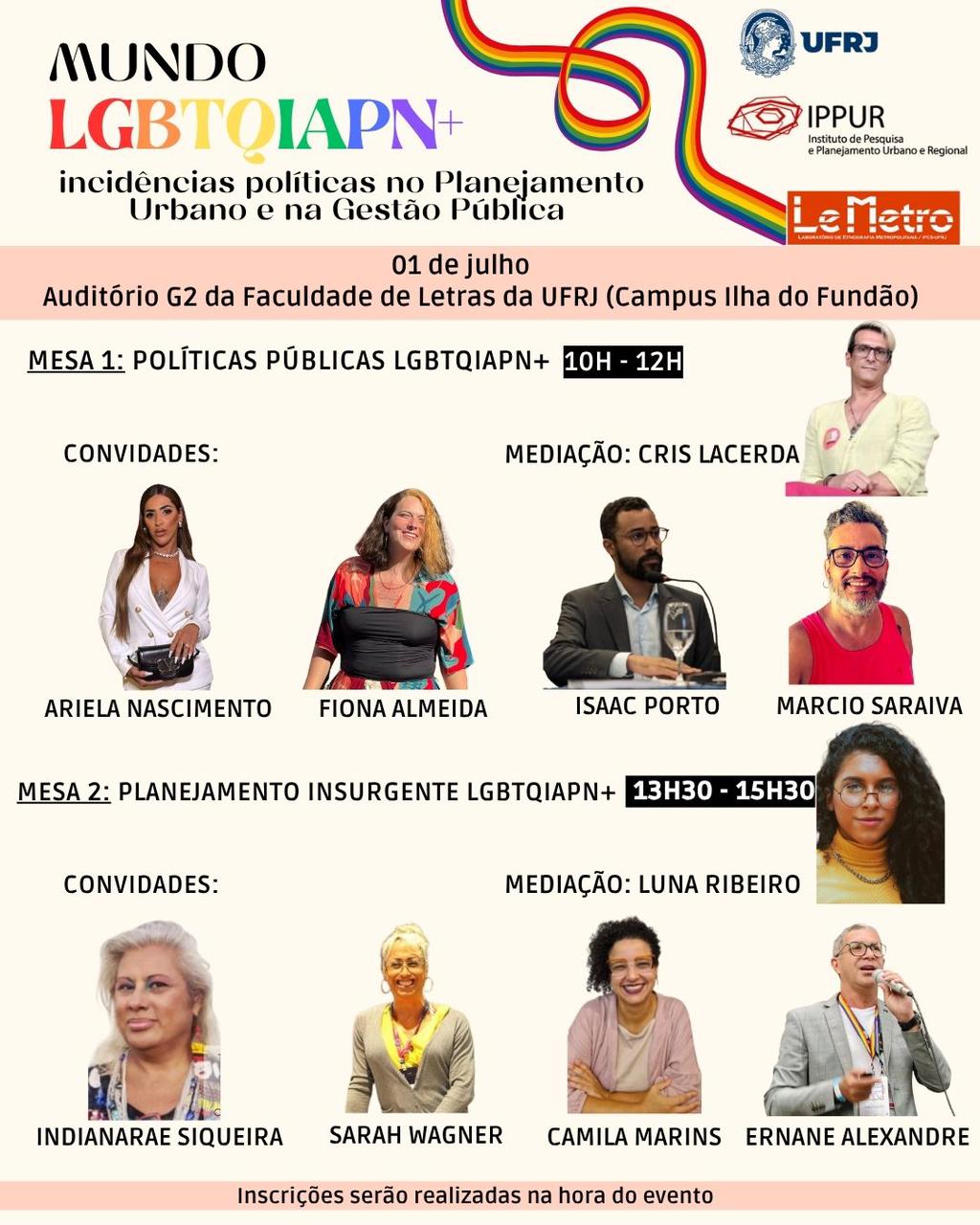 No dia 01 de julho deste ano, em alusão ao Dia do Orgulho LGBTQIAPN+, celebrado dia 28 de junho¹, us alunes do doutorado e mestrado do Instituto de Pesquisa e Planejamento Urbano e Regional (IPPUR) da UFRJ, em parceria com o Laboratório de Etnografia Metropolitana – LeMetro e IPPUR realizaram uma potente mesa de debate chamada “Mundo LGBTQIAPN+: Incidências políticas no planejamento urbano e regional e na gestão pública”.