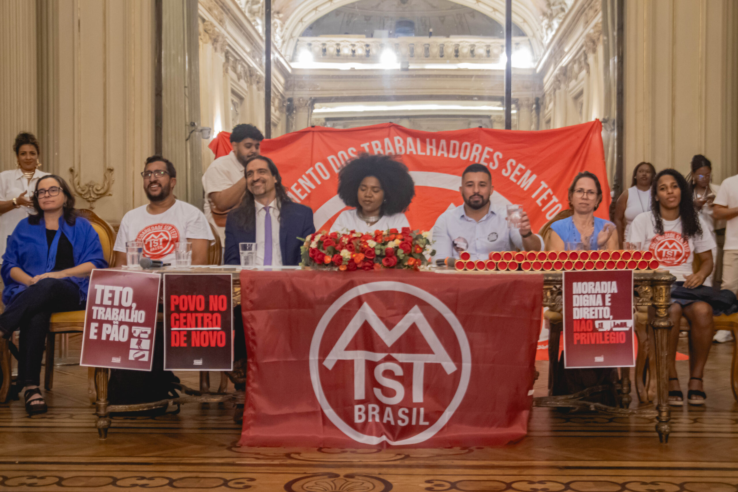 O evento reuniu cerca de 100 famílias organizadas pelo MTST e foi marcado por discursos fortes, denúncias de remoções em curso no estado e manifestações populares. A Câmara Municipal foi iluminada em vermelho como gesto simbólico em defesa da moradia digna e da luta popular.