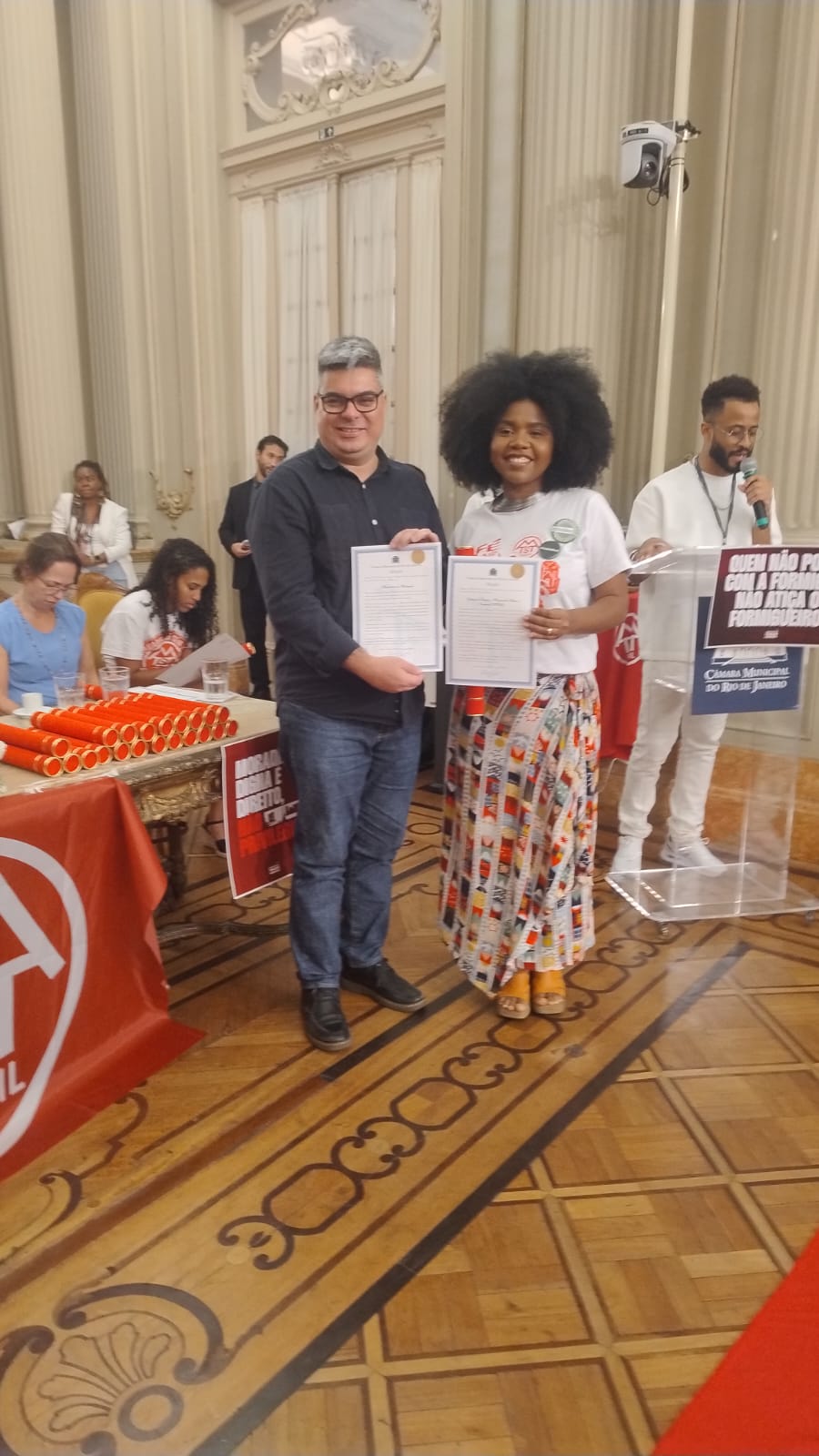 A mesa de honra, constituída pela vereadora Thais Ferreira, contou com a presença da deputada estadual Renata Souza; do deputado estadual Yuri Moura; do defensor público da União, Dr. Thales Treiger; do coordenador nacional do MTST, Gabriel Siqueira; da coordenadora do Núcleo de Terras e Habitação (NUTH) da Defensoria Pública, Dra. Marília Corrêa Pinto de Farias; da coordenadora do Núcleo de Assessoria Jurídica Popular Luiza Mahin, da FND/UFRJ, Mariana Trotta; e da militante do MTST, Márcia Beatriz. Também receberam homenagens o Instituto de Arquitetos do Brasil – Seção Rio de Janeiro (IAB/RJ), representado por sua presidente, Marcela Abla, e a conselheira do CAU/RJ, Dai Cândido.