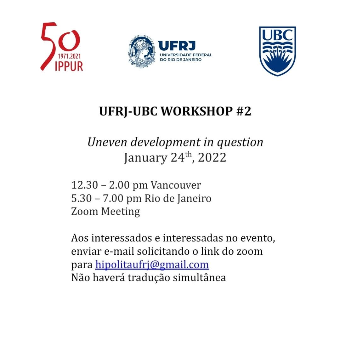 Evento: UFRJ-UBC WORKSHOP #2 Uneven development in question Data: 24/01/2022 12.30 [...]
